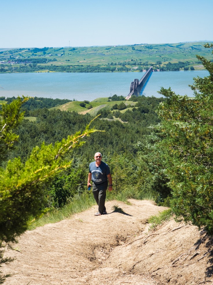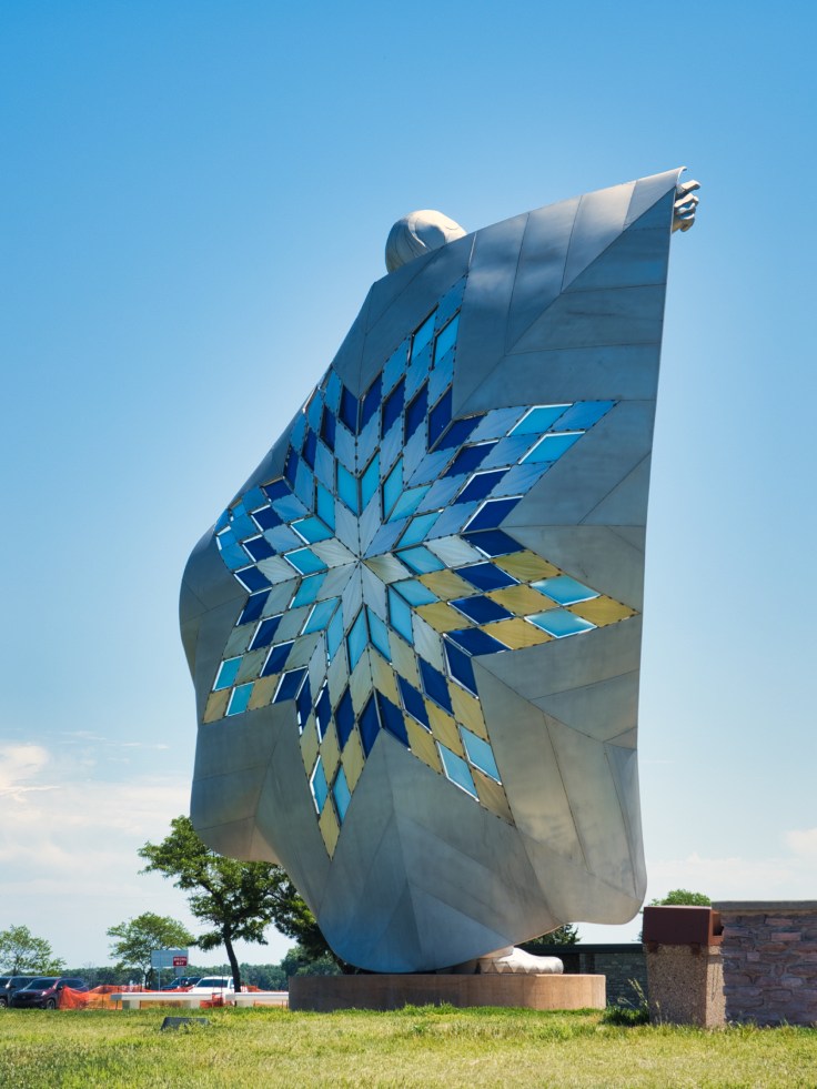 This beautiful sculpture was designed by Dale Lamphere to honor the cultures of the Lakota and Dakota people. She stands 50′ tall and is wrapped in a star quilt. How fitting that one of our first stops was to see this magnificent sculpture wrapped in a quilt. And once we arrived here we realized we had stopped on the other side of the highway to visit a quilt store the last time we were in the area. There is a lovely walkway that takes you to these beautiful views over the Missouri River. To learn more about Dignity of Earth and Sky click here.