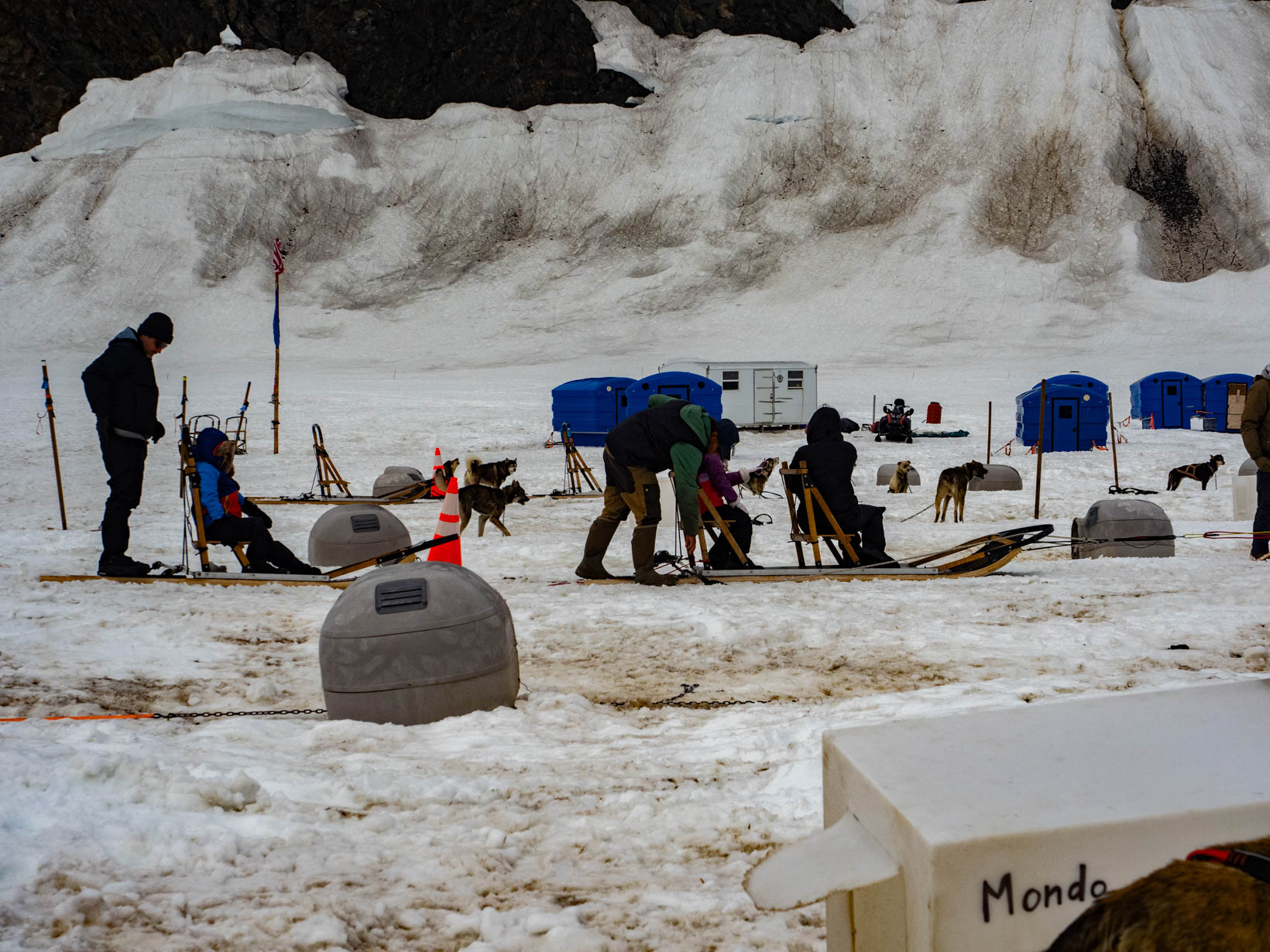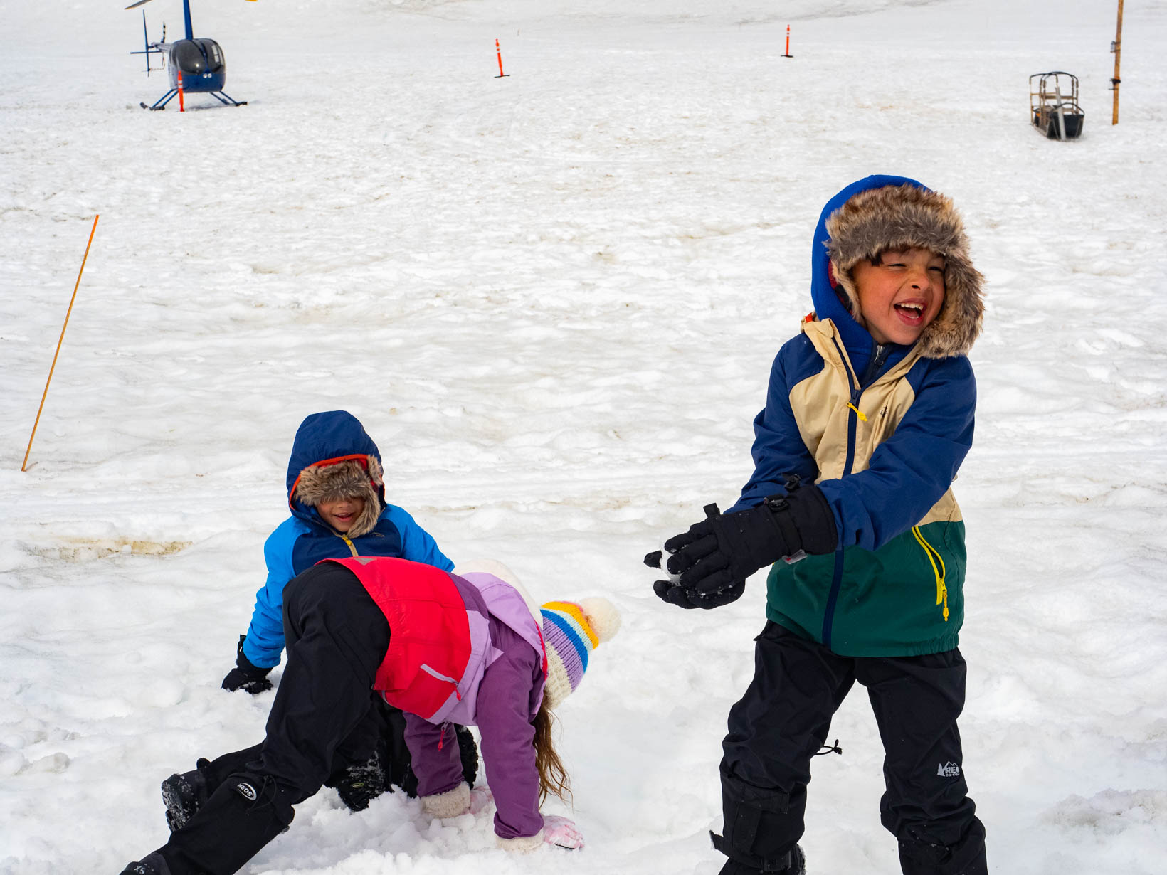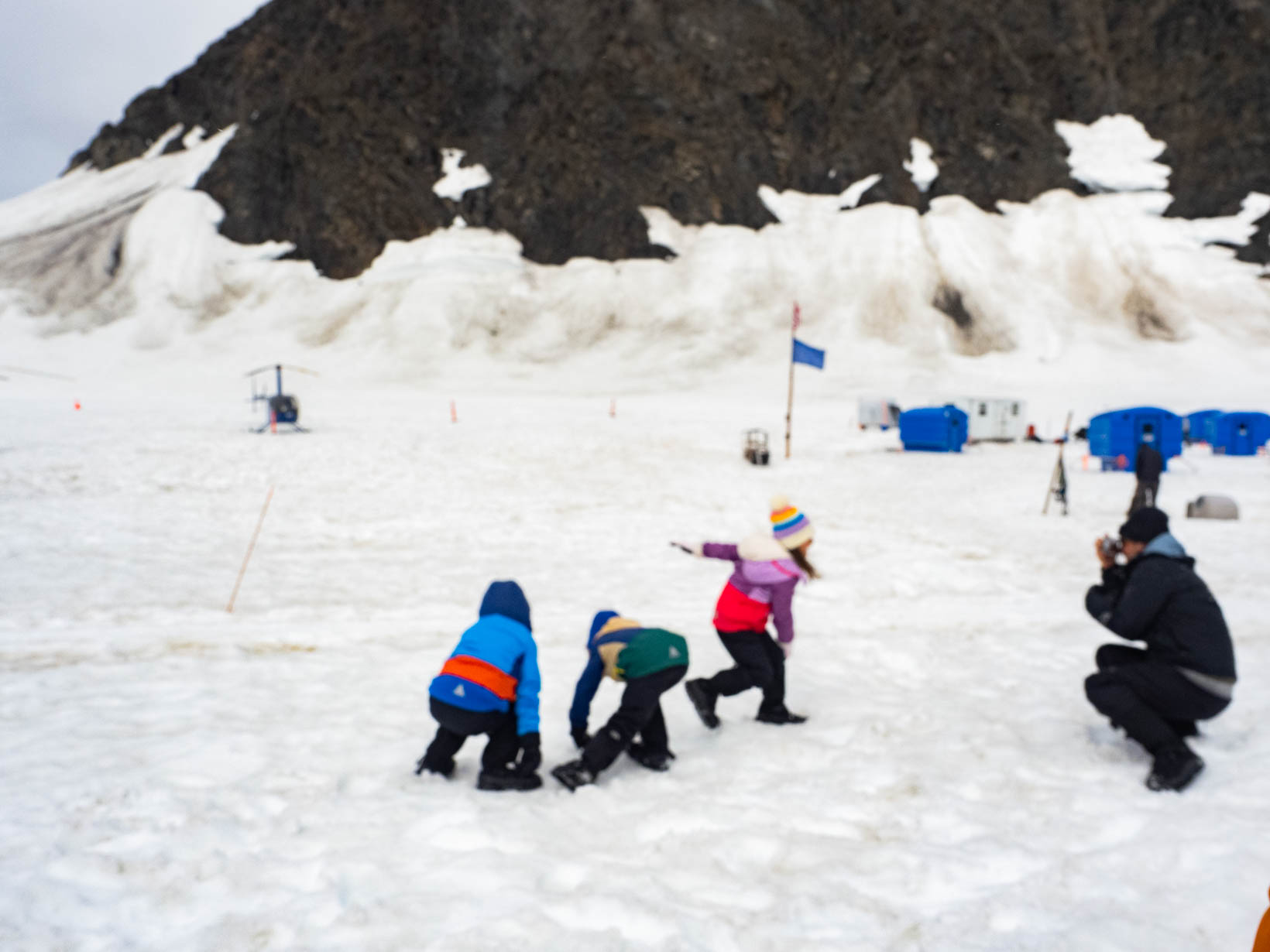 This was the highlight of this trip. Our first ride on a helicopter. I was still a bit nervous so I let John sit up front. Here is the video from our take off taken by John. I got a video of the Leclairs taking off after our first excursion. Our first stop was to go dog sledding on a glacier. We met our driver and he gave quick instructions for anyone who wanted a chance at driving the dogs. I did not. I could just see everyone tipping over because I did not do something right. There was another couple with me and John so they took turns and then John took a turn. I might have tried driving if it was just me and John–tipping him over wouldn’t be too embarassing. I never changed seats but you never saw me try to get up off the ground and that seat was that low. Getting out of the helicopter was difficult enough. My feet are so big, I have to turn them side ways before I can step out. Not easy. John laughed. I should have taken the front seat with all the “foot” room. Then I could laugh as he tried to get out of the helicopter. Anyway back to the dogsledding. With John in the front–we are off. The kids had a ball. They just loved playing in the snow. Making angels, throwing snowballs.
