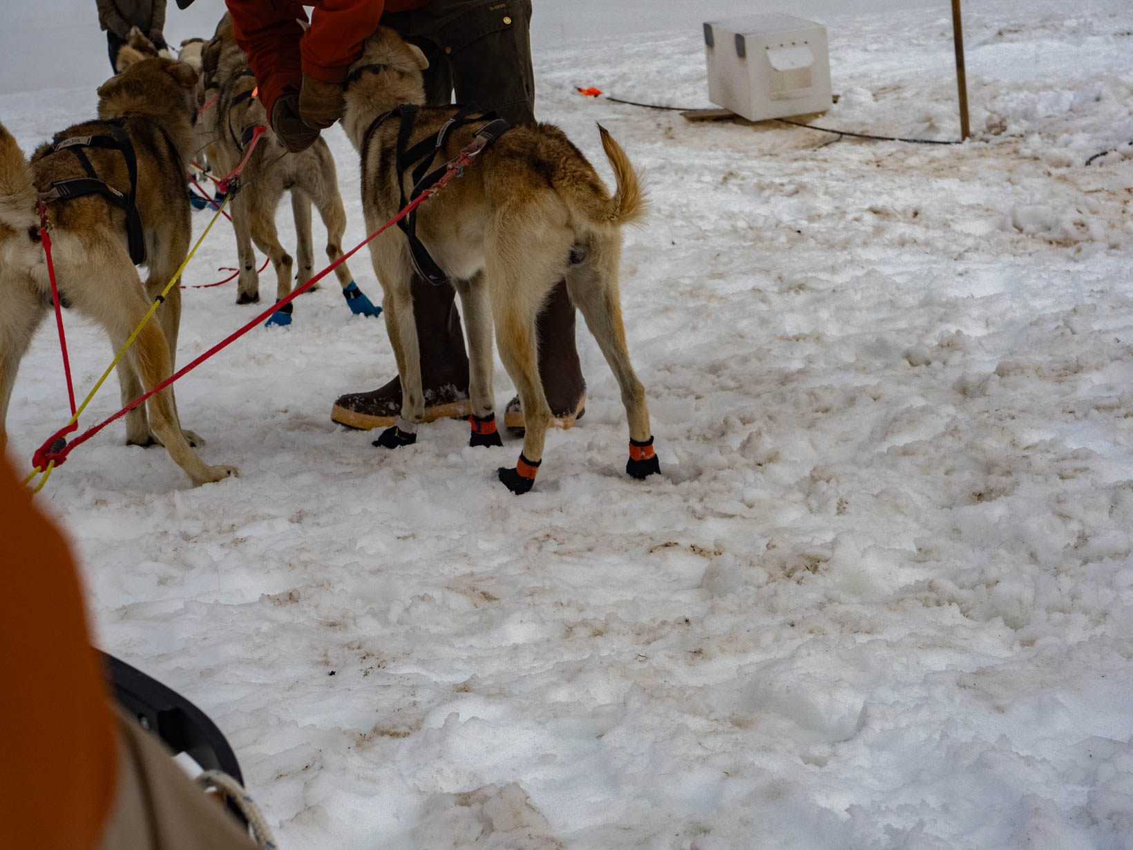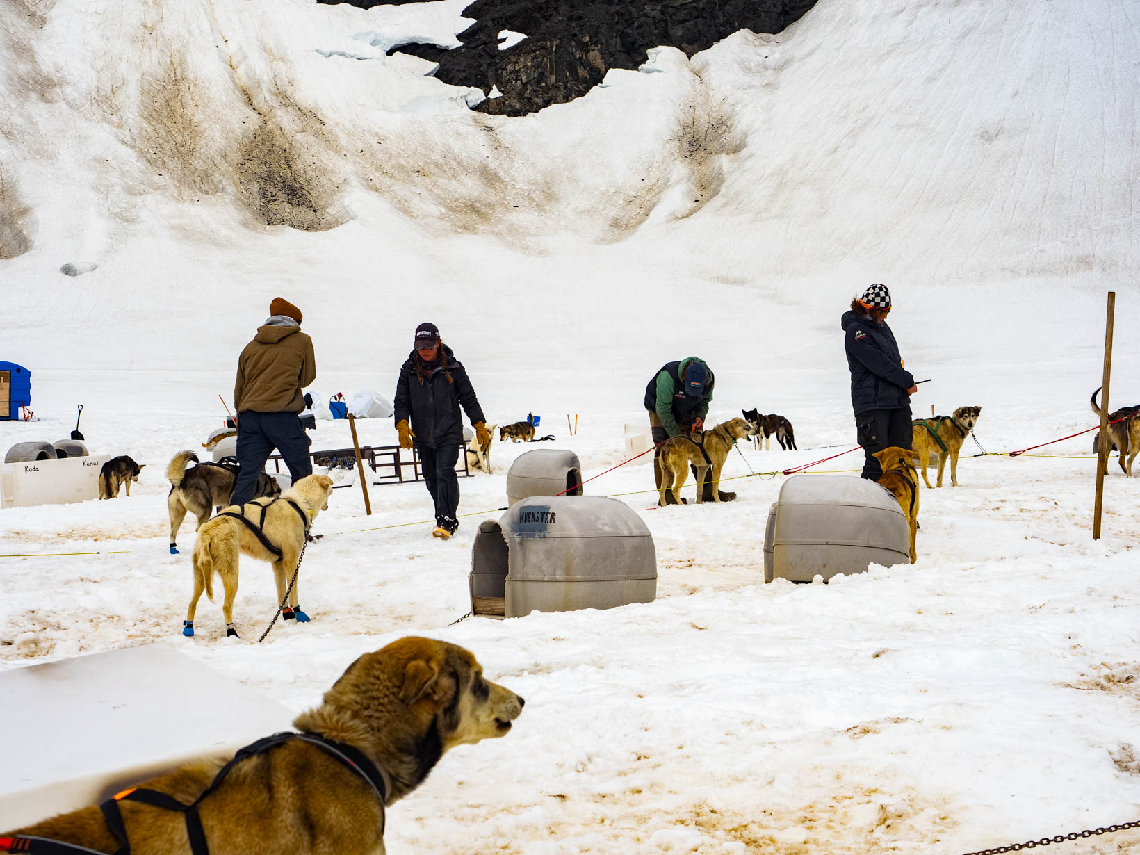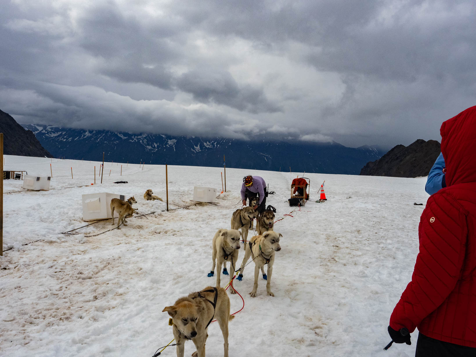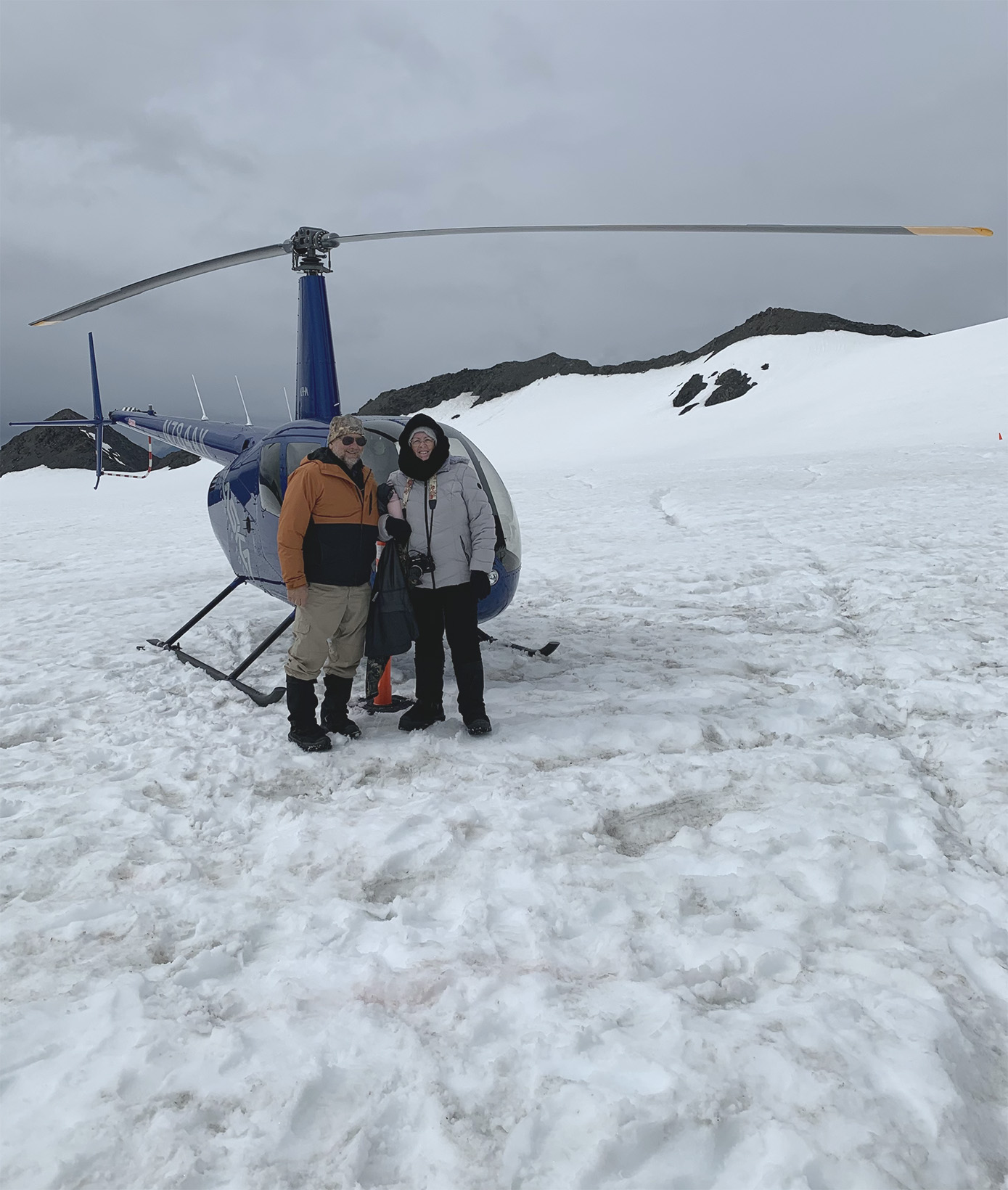 This was the highlight of this trip. Our first ride on a helicopter. I was still a bit nervous so I let John sit up front. Here is the video from our take off taken by John. I got a video of the Leclairs taking off after our first excursion. Our first stop was to go dog sledding on a glacier. We met our driver and he gave quick instructions for anyone who wanted a chance at driving the dogs. I did not. I could just see everyone tipping over because I did not do something right. There was another couple with me and John so they took turns and then John took a turn. I might have tried driving if it was just me and John–tipping him over wouldn’t be too embarassing. I never changed seats but you never saw me try to get up off the ground and that seat was that low. Getting out of the helicopter was difficult enough. My feet are so big, I have to turn them side ways before I can step out. Not easy. John laughed. I should have taken the front seat with all the “foot” room. Then I could laugh as he tried to get out of the helicopter. Anyway back to the dogsledding. With John in the front–we are off. The kids had a ball. They just loved playing in the snow. Making angels, throwing snowballs.