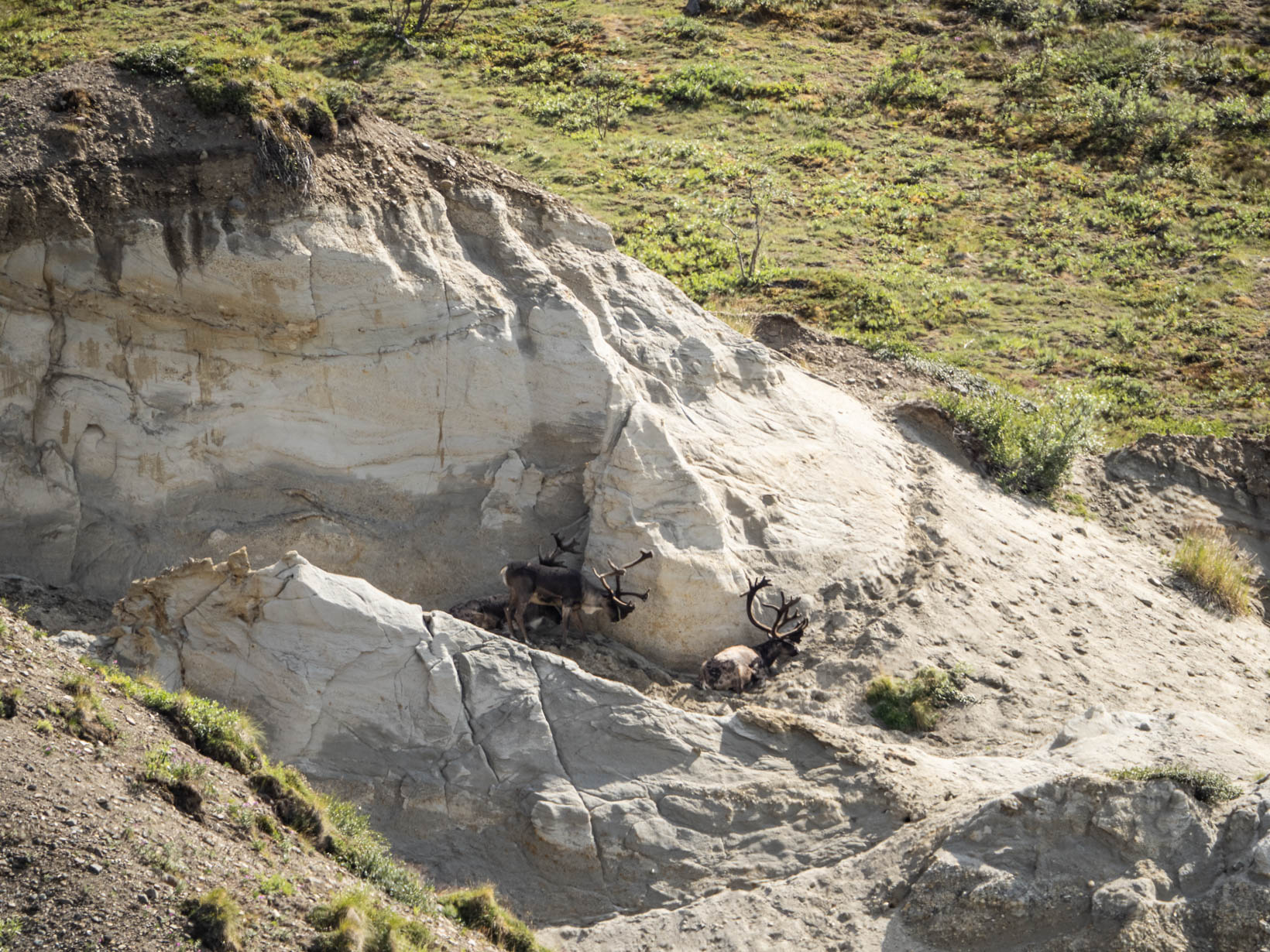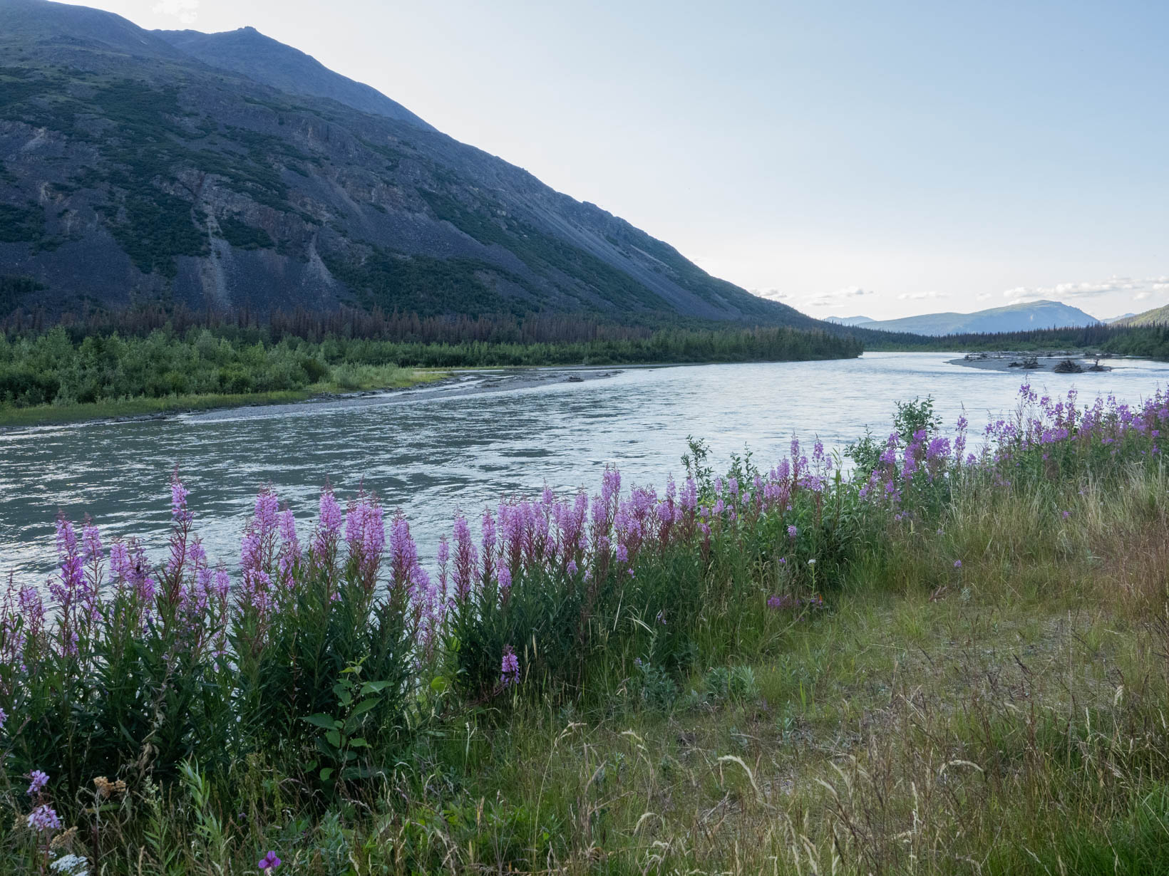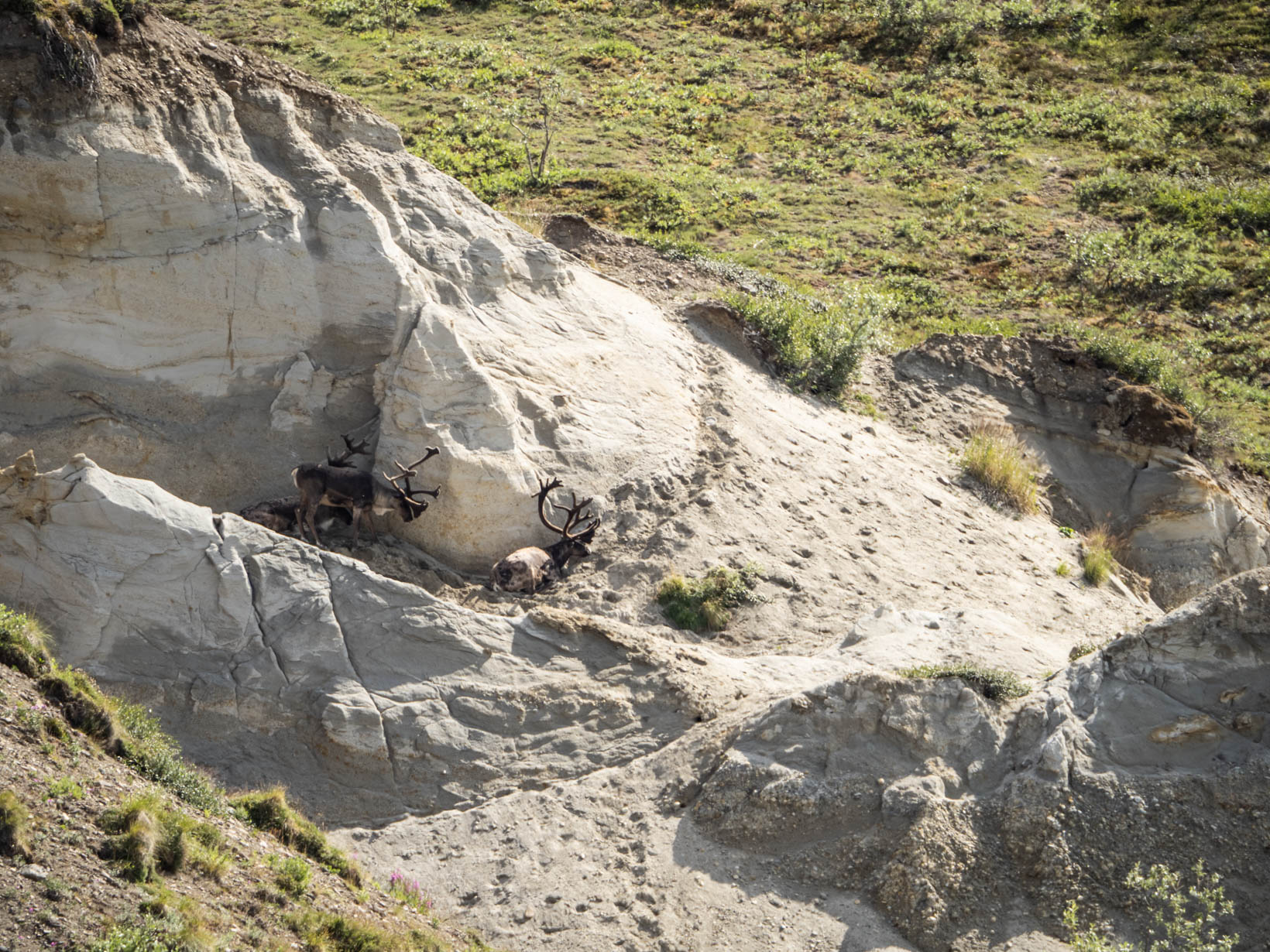 But we did see some Dall sheep, caribou and a black wolf–no shots of that. It was on the other side of the bus and no one wanted to open their window so you not only are trying to take a picture of this running object that is a mile away but everyone was shooting through a dirty window. We left Denali to head for a place on the side of the road that we saw on the way in. We got a great spot along the Nenana River along with several other campers.