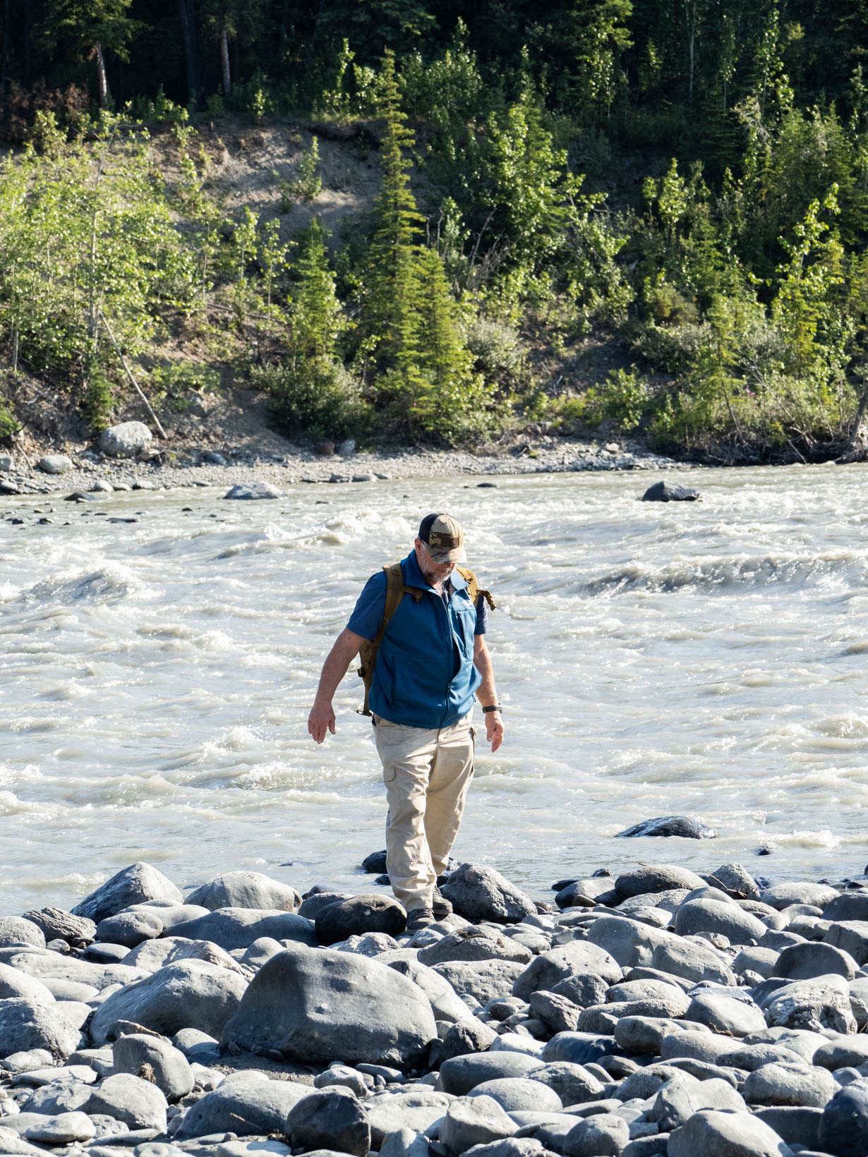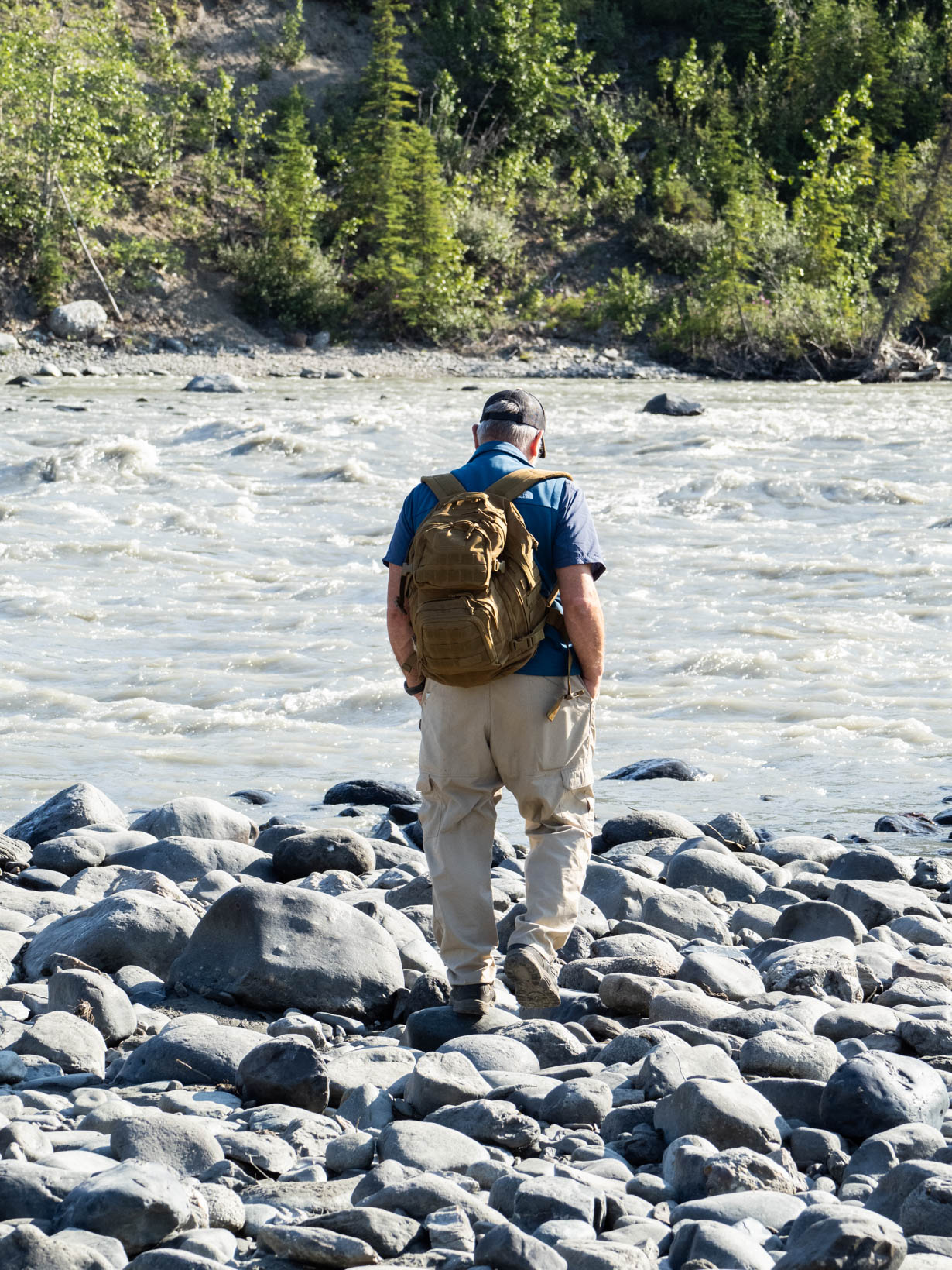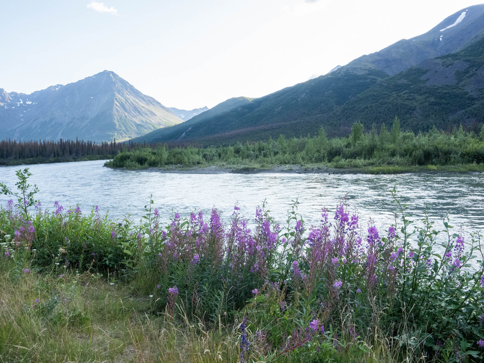 But we did see some Dall sheep, caribou and a black wolf–no shots of that. It was on the other side of the bus and no one wanted to open their window so you not only are trying to take a picture of this running object that is a mile away but everyone was shooting through a dirty window. We left Denali to head for a place on the side of the road that we saw on the way in. We got a great spot along the Nenana River along with several other campers.