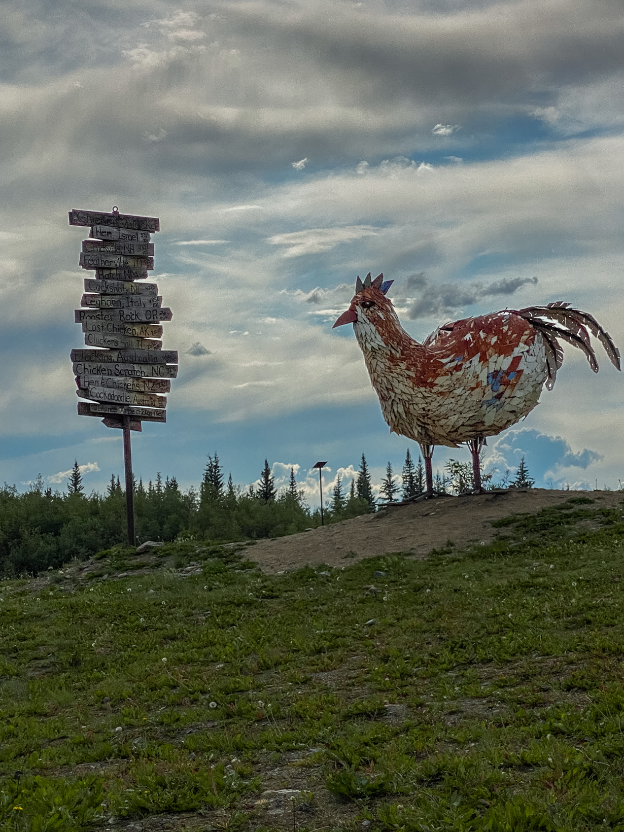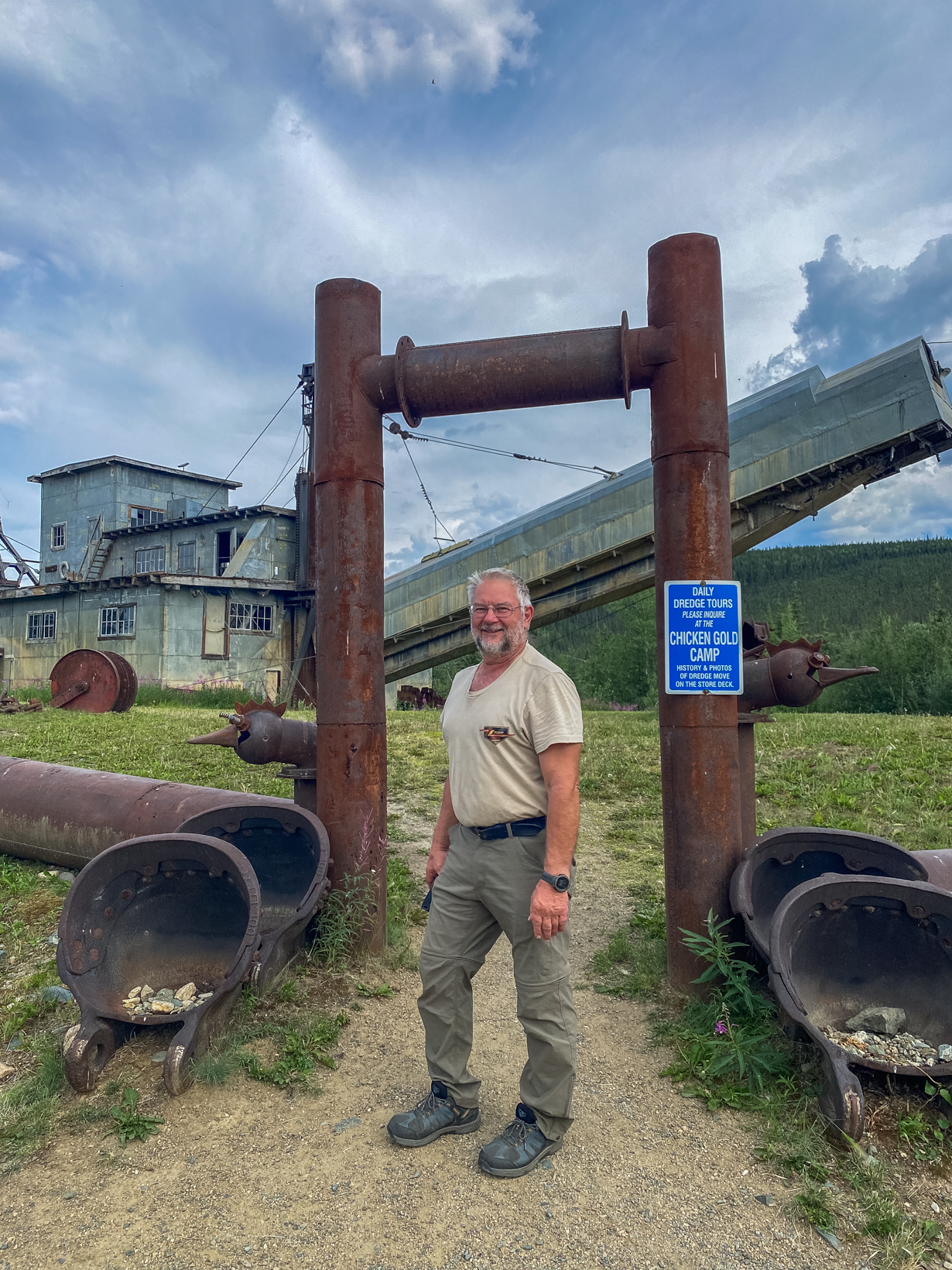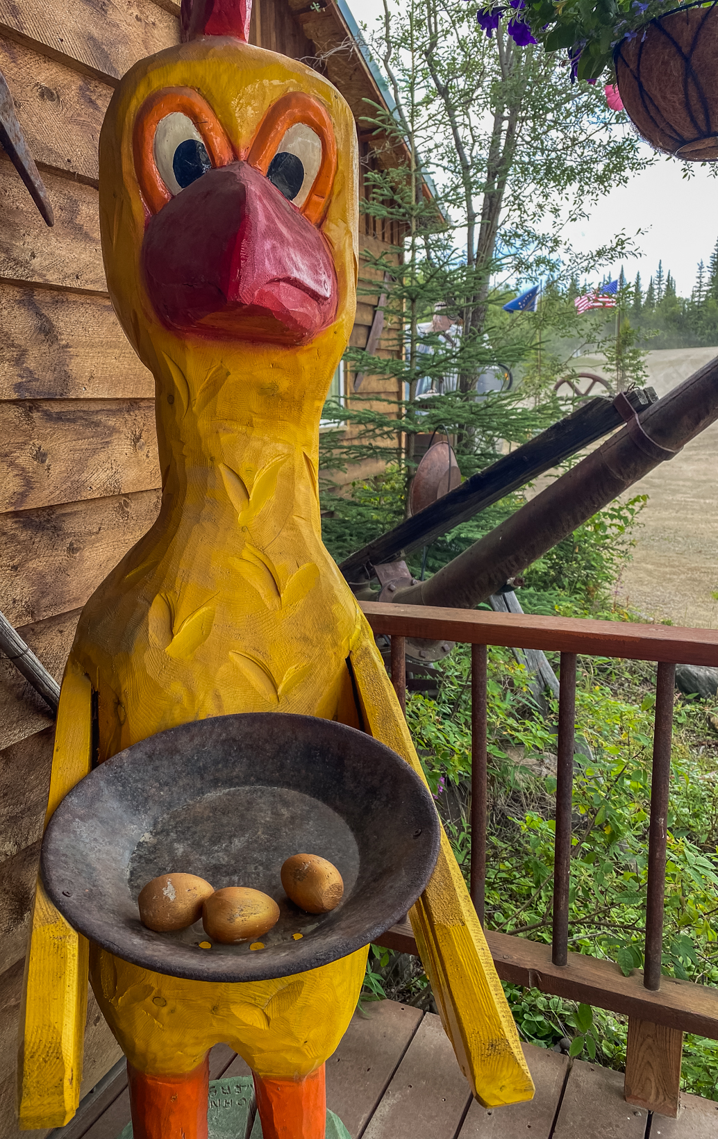 We left Fairbanks heading for Chicken, Alaska. We planned to meet up with Judy and Mike at the campground before we cross the border back into Canada. It took much longer than we had anticipated as the road to Chicken was probably the worst road we have traveled so far. In addition we had no service for the longest time. Longer than I had thought we would. I honestly thought we would have service as soon as we arrived in Chicken. Joke was on me. Chicken is comprised of 12 residents–and I believe they all work at the 2 campgrounds there. Back in the day Chicken was a gold mining town–well actually they are still mining gold and the 2 campgrounds allow you to pan while you are there. Guess what we did?