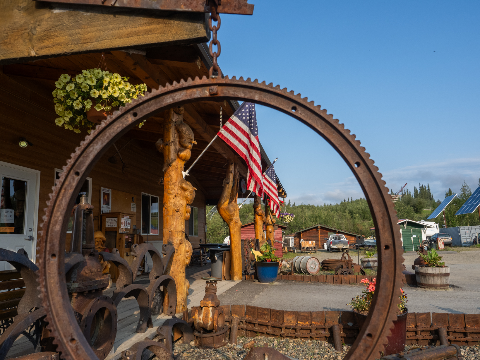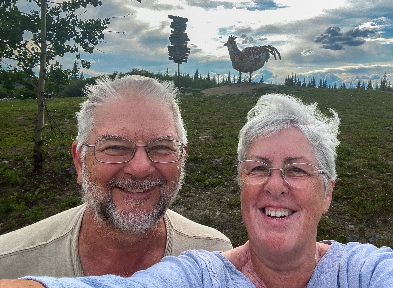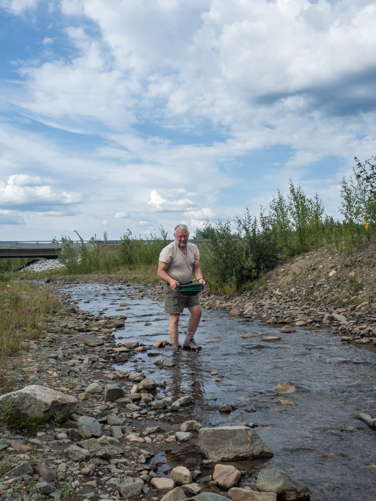 We left Fairbanks heading for Chicken, Alaska. We planned to meet up with Judy and Mike at the campground before we cross the border back into Canada. It took much longer than we had anticipated as the road to Chicken was probably the worst road we have traveled so far. In addition we had no service for the longest time. Longer than I had thought we would. I honestly thought we would have service as soon as we arrived in Chicken. Joke was on me. Chicken is comprised of 12 residents–and I believe they all work at the 2 campgrounds there. Back in the day Chicken was a gold mining town–well actually they are still mining gold and the 2 campgrounds allow you to pan while you are there. Guess what we did?