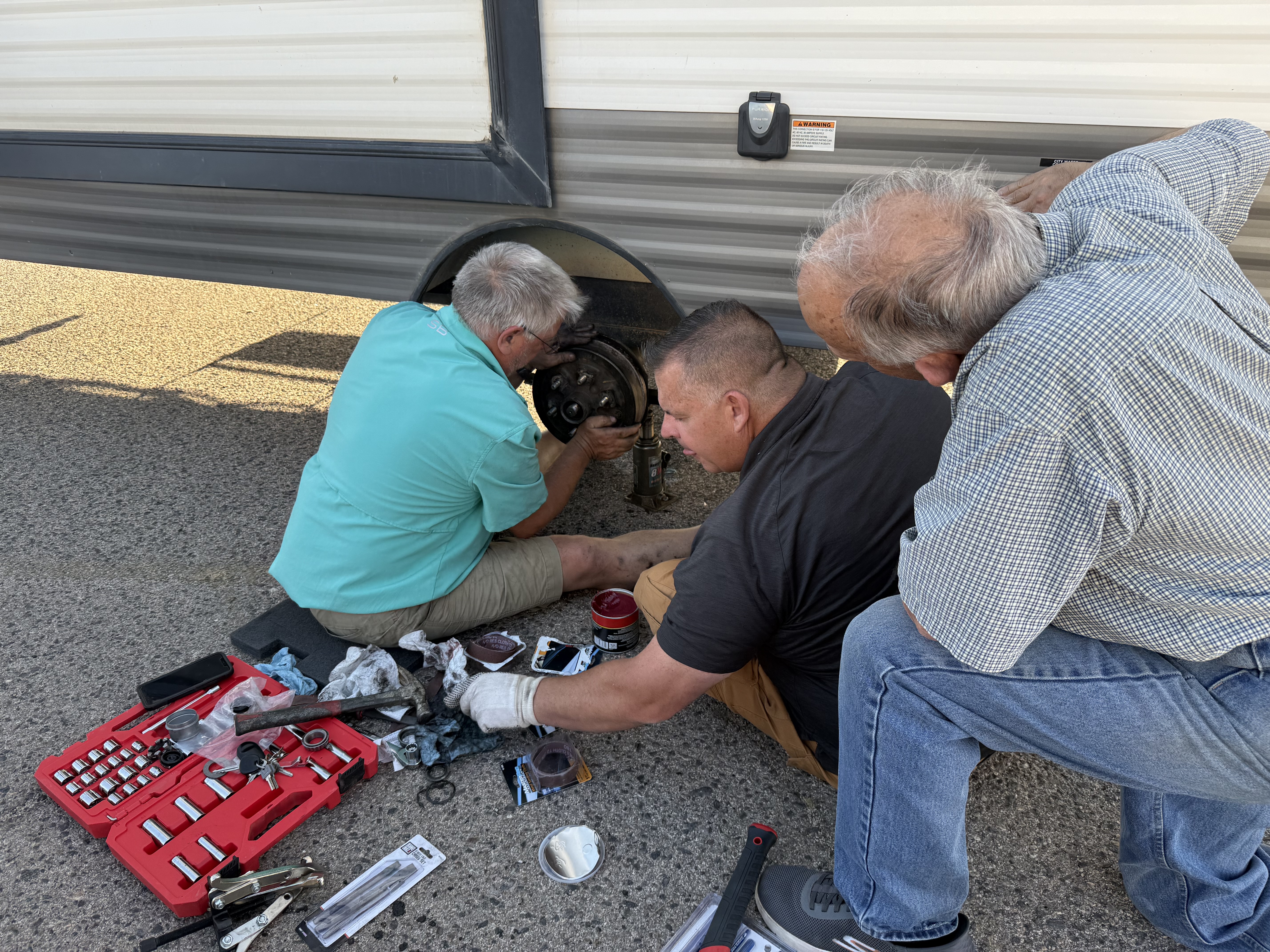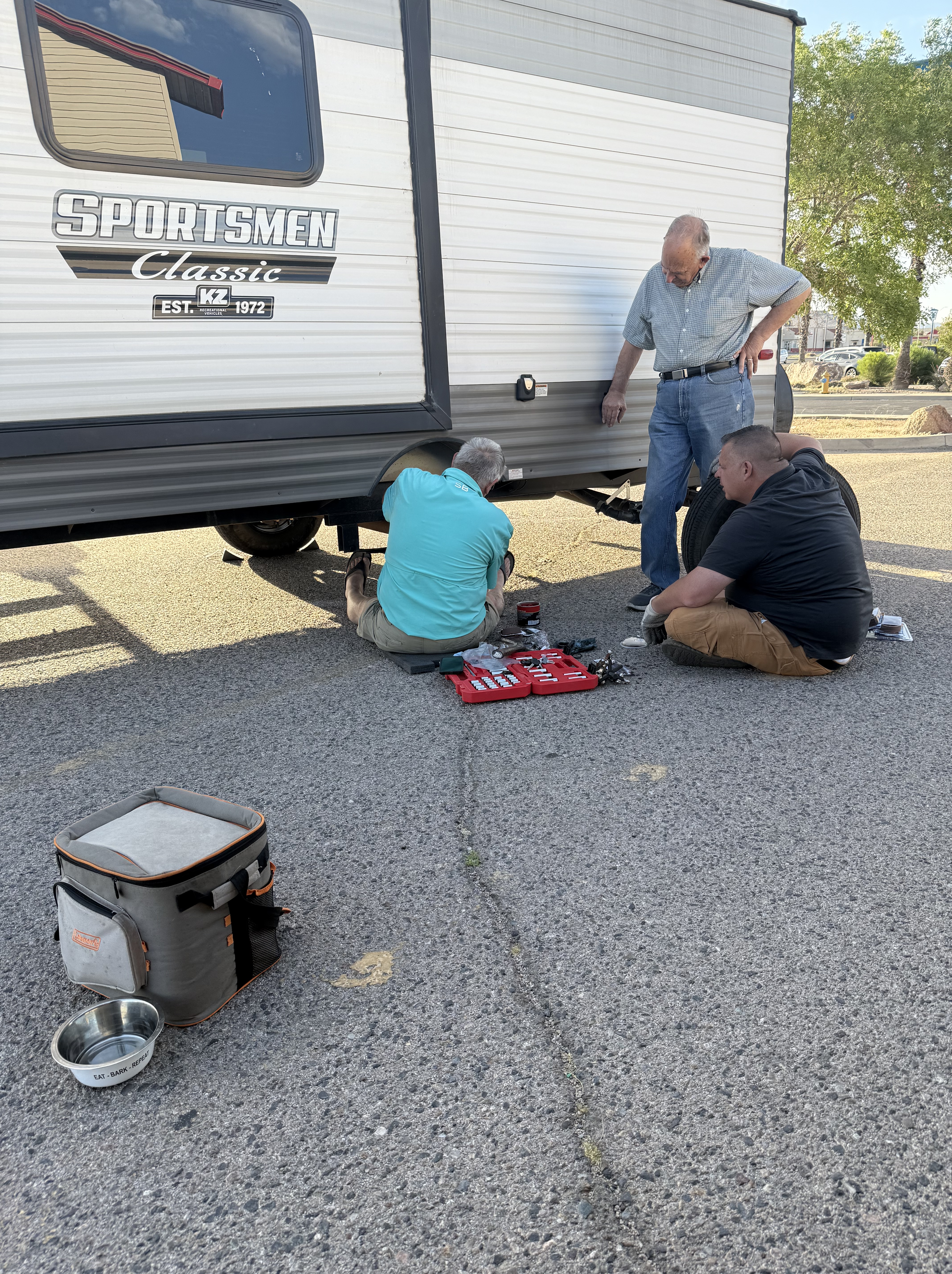 Our arrival in Kingman, AZ came with an unexpected breakdown. Luckily for us, David Steffen saw smoke coming from the trailer tires and waved us down. We had no clue. He thought the brakes locked but John saw it was a lost bearing. David and his mom and dad, not only stayed around to help, they ran to the store for tools while John and I ran to pick up parts. This entire ordeal took about 3 hours and they stuck with us the entire time. Even offered to let John shower at their house. Wouldn’t take a dime from us. OMG how lucky/blessed can you get? I can’t believe there are such wonderful people out there.