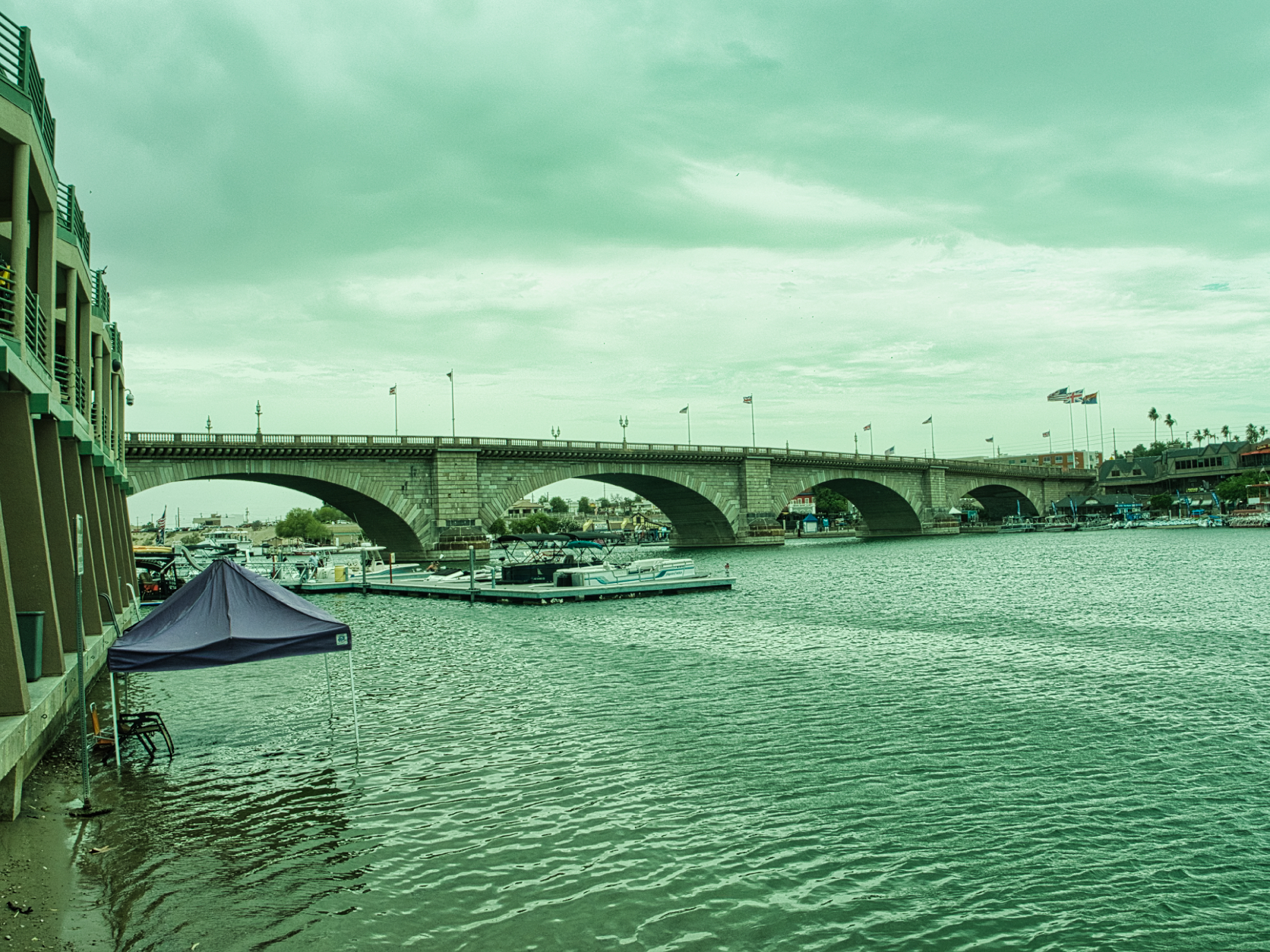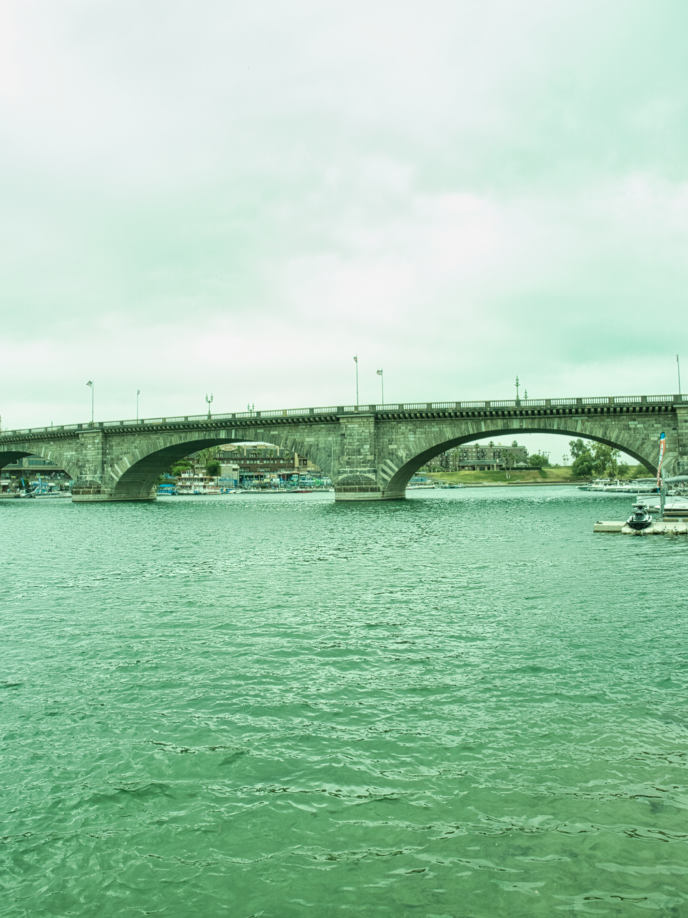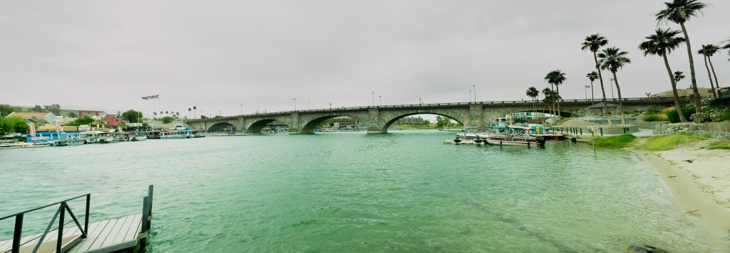 Anyway, onward to Havasu. The London Bridge was purchased in 1964 by Robert P. McCulloch, Sr. for $2.46 million, then dismantled and shipped by boat from England to the U.S. It was rebuilt on a peninsula on Lake Havasu in 1971 for an additional $5.1 million. A channel was excavated under the bridge, and a replica English Village was built next to it. The opening of the London Bridge in October 1971 brought the world’s largest antique to the area, a world-famous attraction that continues to draw tens of thousands of sightseers to Lake Havasu City. ( taken from https://www.golakehavasu.com/media-room/fact-sheet/)