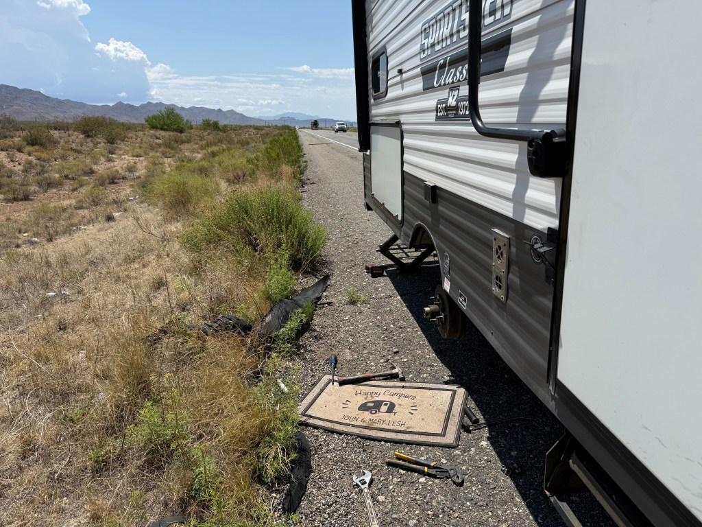 Yup! We had a blowout! Just after leaving Kingman we heard a whoosh sound and immediately pulled over. It was funny (not really) but, John had just mentioned the tire pressure gauge looking good and then the whoosh. That was a new tire and it was totally shredded and wrapped around the wheel/axle. It was hard enough for John to get it jacked up because we were on a slant on the side of the flat–at least that is what I think was happening. I did get out to help because we were on the highway and I was really worried. We immediately went back to Kingman to buy a new wheel and tire. By immediately I do mean after John changed it. So maybe an hour later. And to think I was so worried about getting to Vegas too early to check in. That wasn’t a problem.
