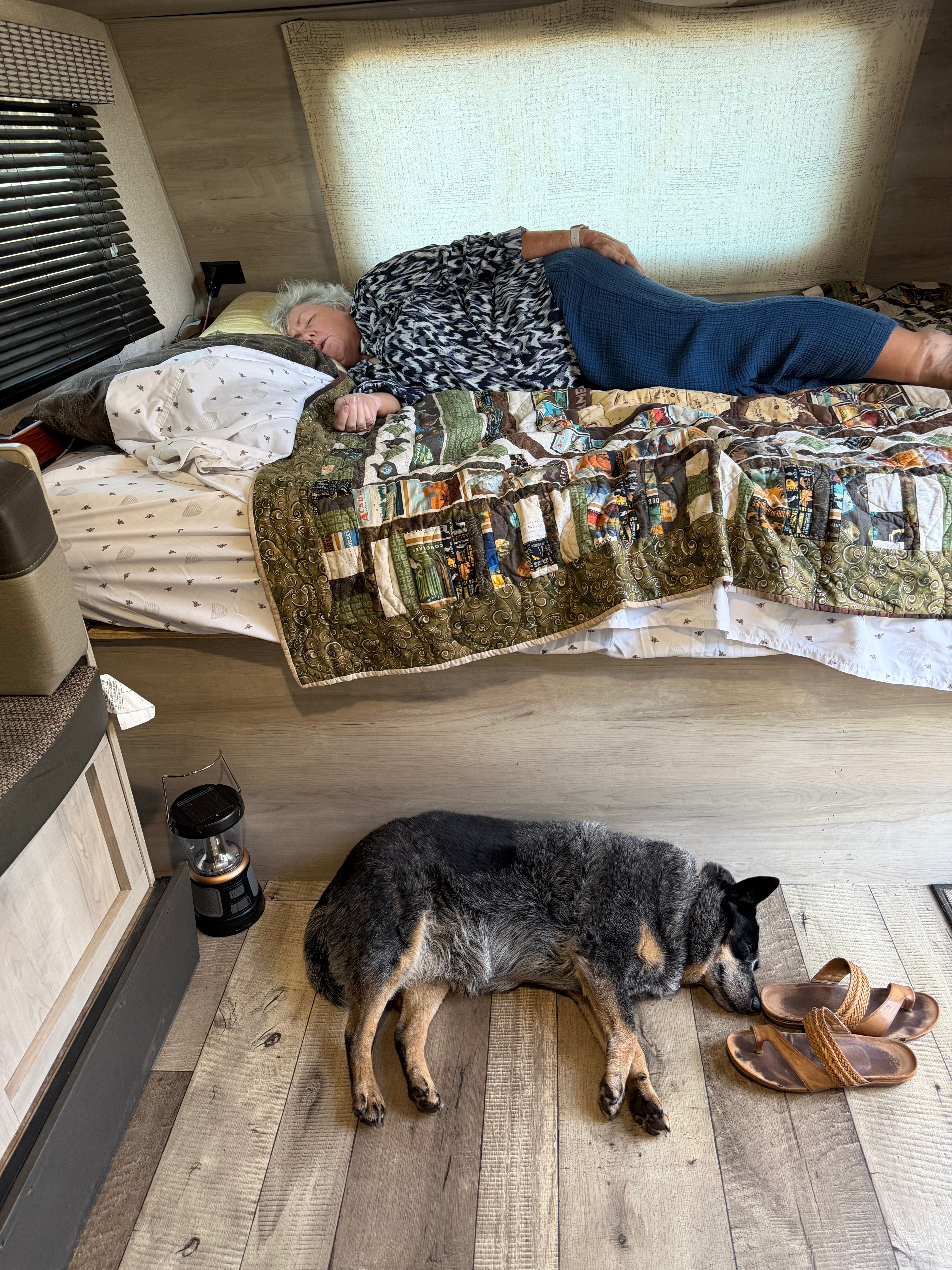 The next morning we got up to go to a walk at a Bayou but unfortunately we could not find it. Our gps said we had arrive but there was nothing there. We tried another address–same thing. We were in the middle of a bayou but there were no walkways or parking lots. We did find a parking lot along the street with a dock and boat launch. We stopped and took a few pictures of some ducks and headed for another location. We arrived there only to discover–no pets. Ugh. We went back to the campsite and decided to go ahead and leave. The trails were closed at the park and we could be home in 6 1/5 hours so why not. It was only noon.